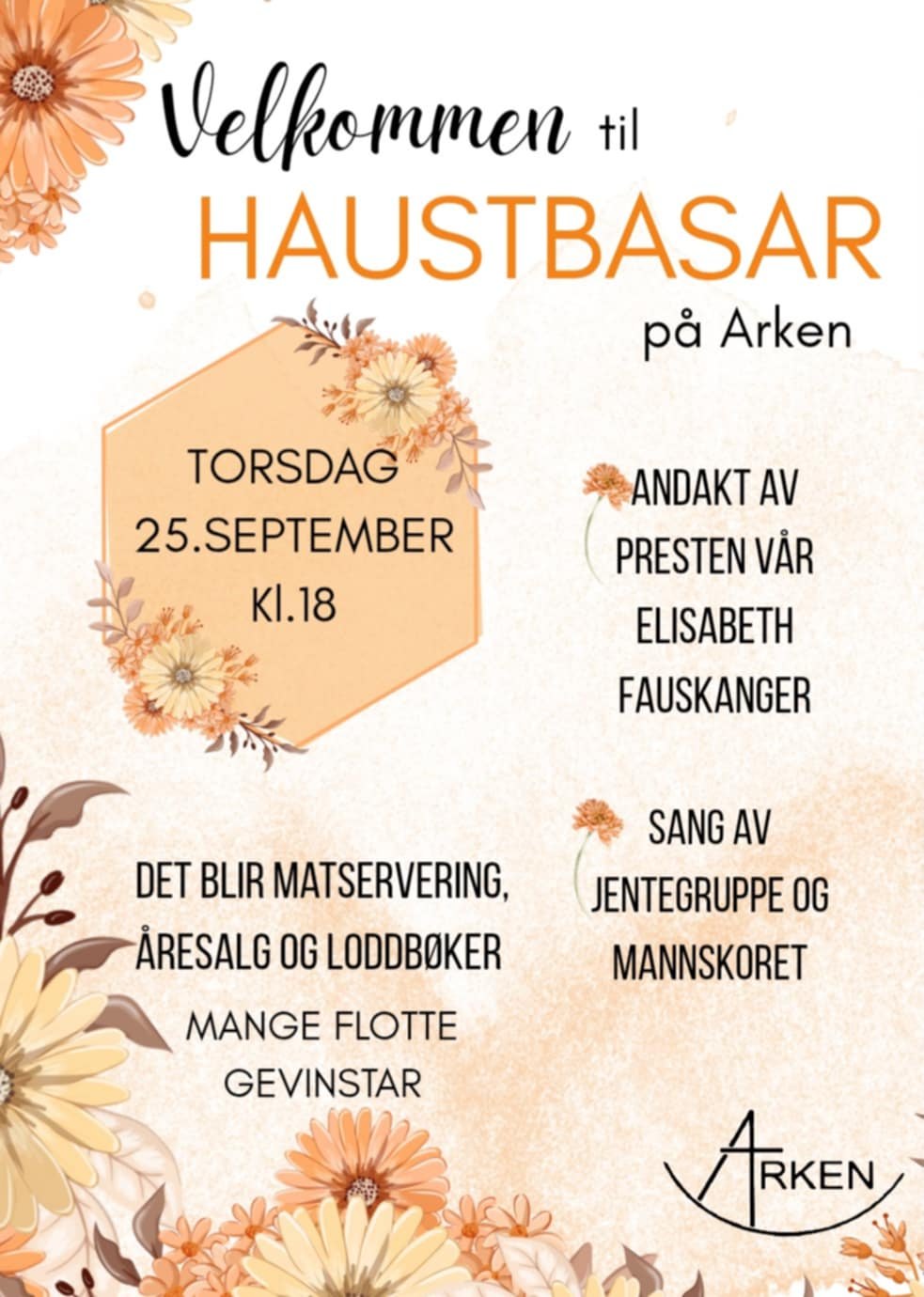 Velkommen til haustbasar på Arken den 25. september. Håper at mange, både små og store har anledning til å sette av denne kvelden. Basaren vil være til inntekt for driften av bedehuset/sokne huset